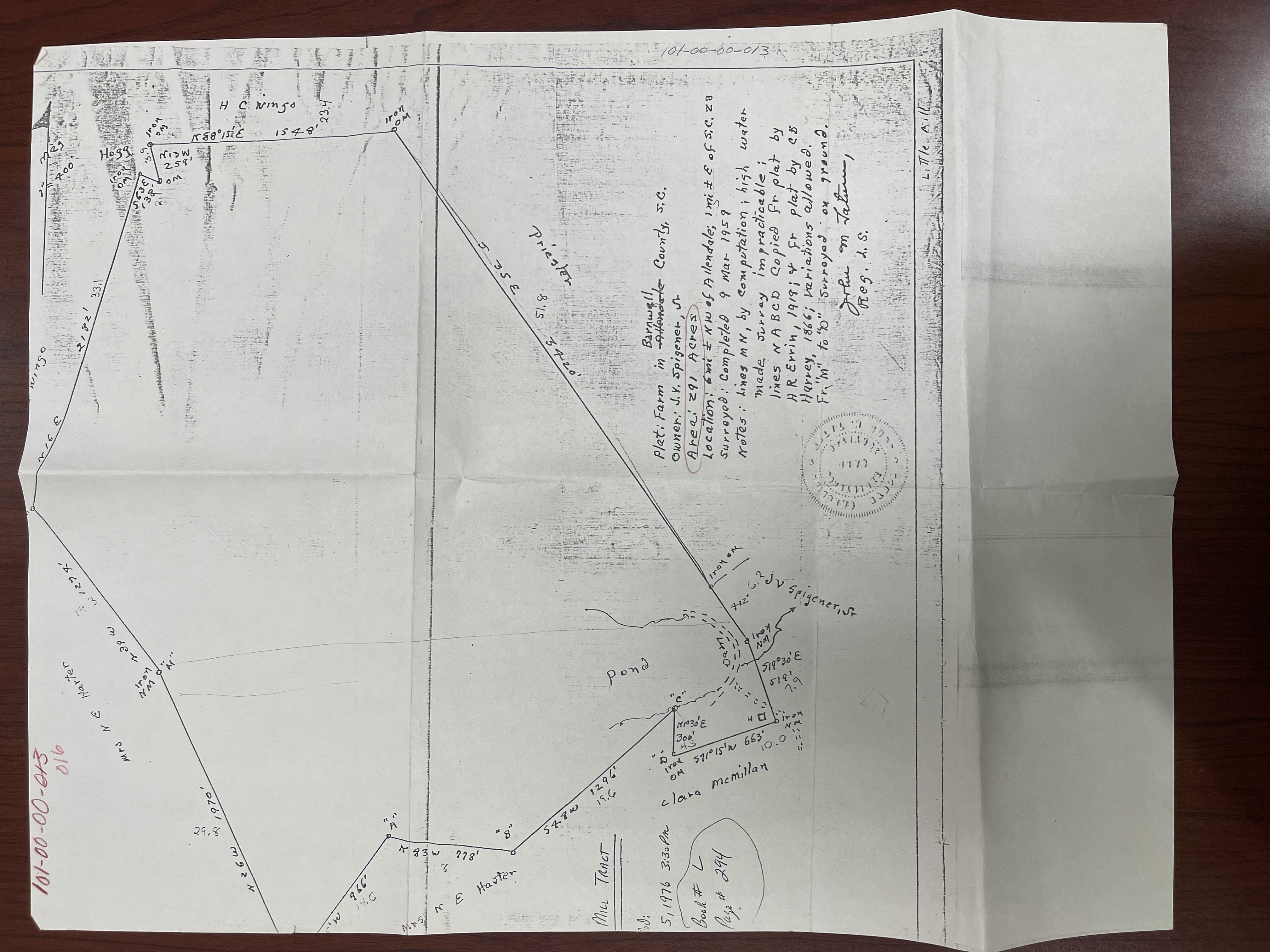 - Plat for Allendale County parcel 101-00-00-016, Farm in Barnwell County owner: Jy Spinger, Sr. Surveyed March 9, 1959.