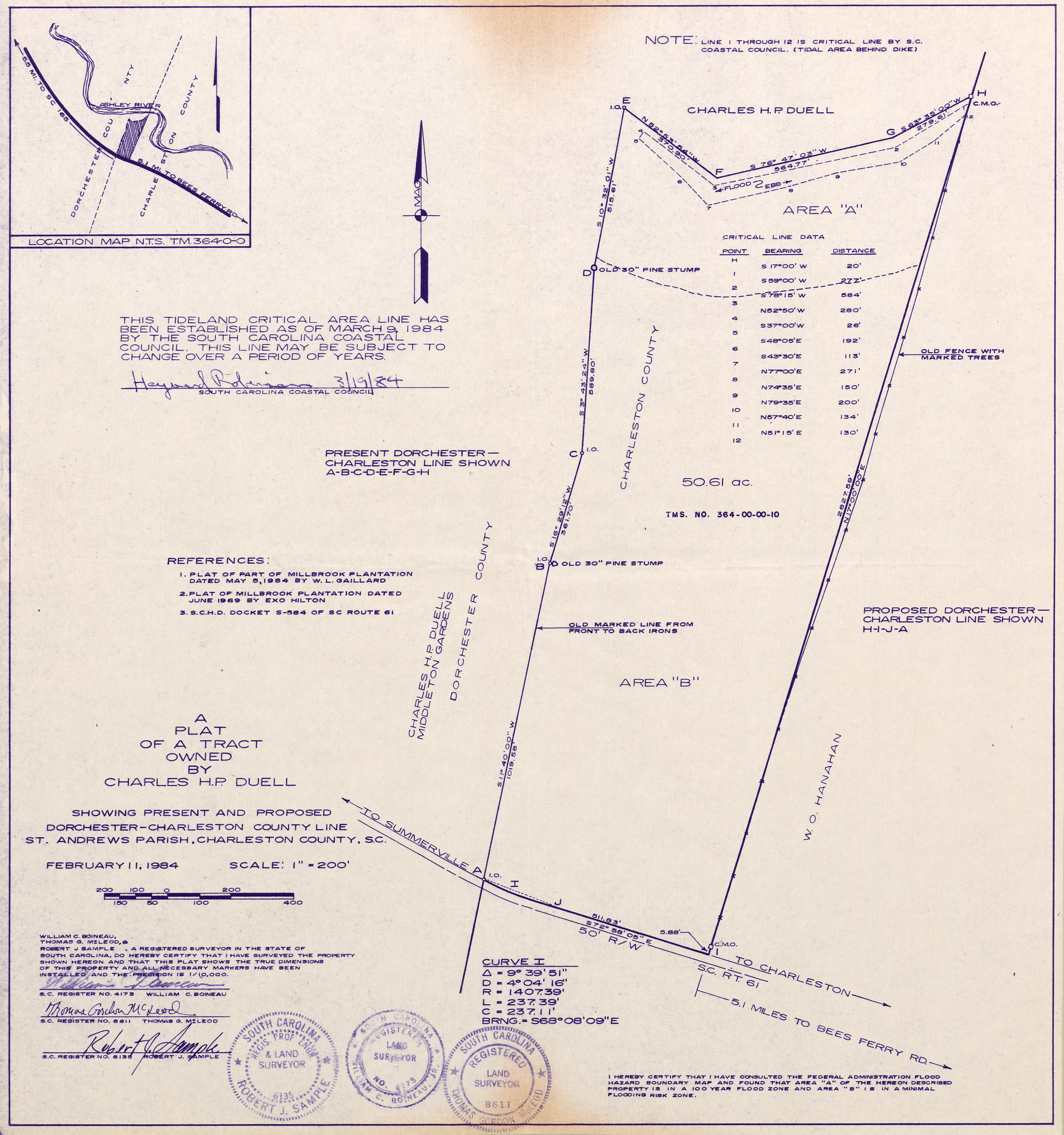 All that tract of land containing 50.61 acres and bounded on the west and north by property of Charles H. P. Duell, on the east by property of W. O. Hanahan, and on the south by South Carolina Highway #61, all as shown a plat entitled ‘A Plat of a Tract owned by Charles H. P. Duell Showing Present and Proposed Dorchester-Charleston County line, St. Andrew’s Parish, Charleston, South Carolina’ dated February 11, 1984, by William C. Boineau, Thomas G. McLeod, and Robert J. Sample”