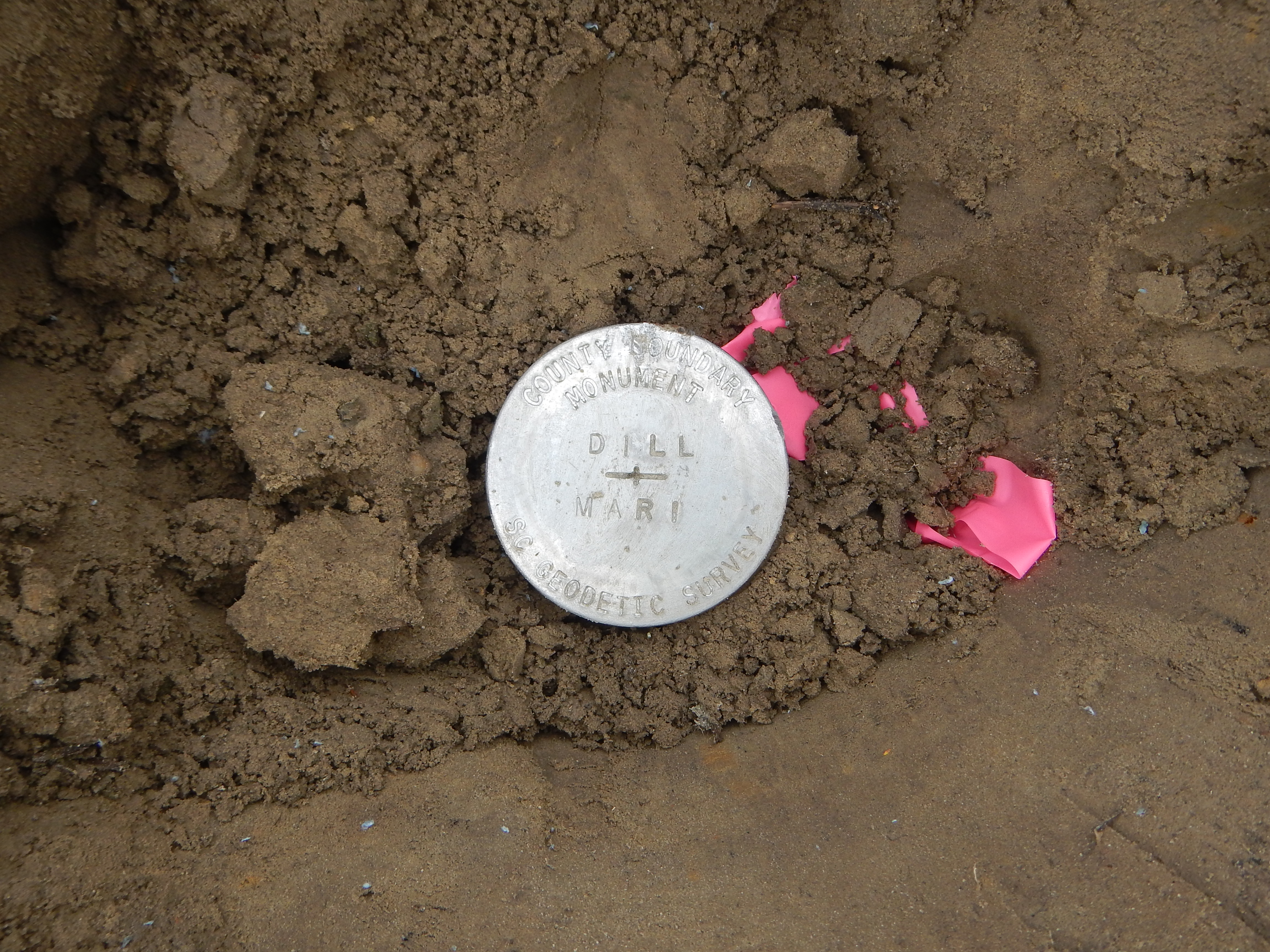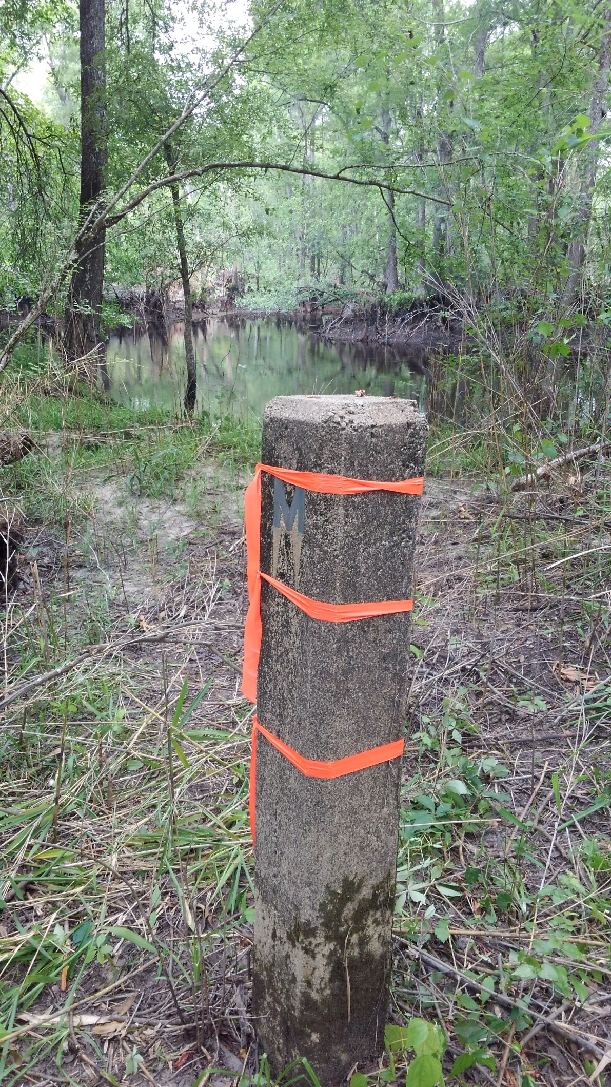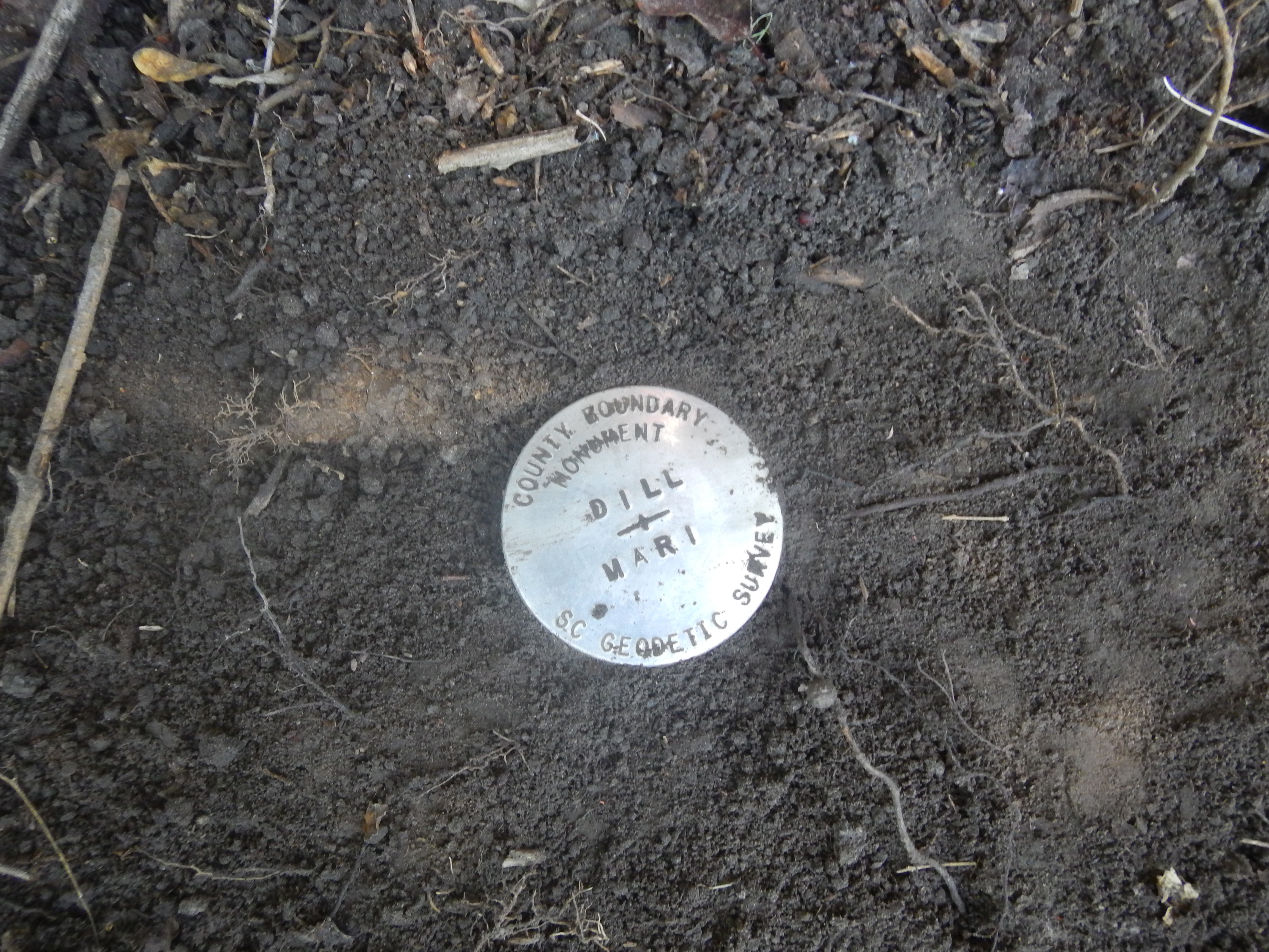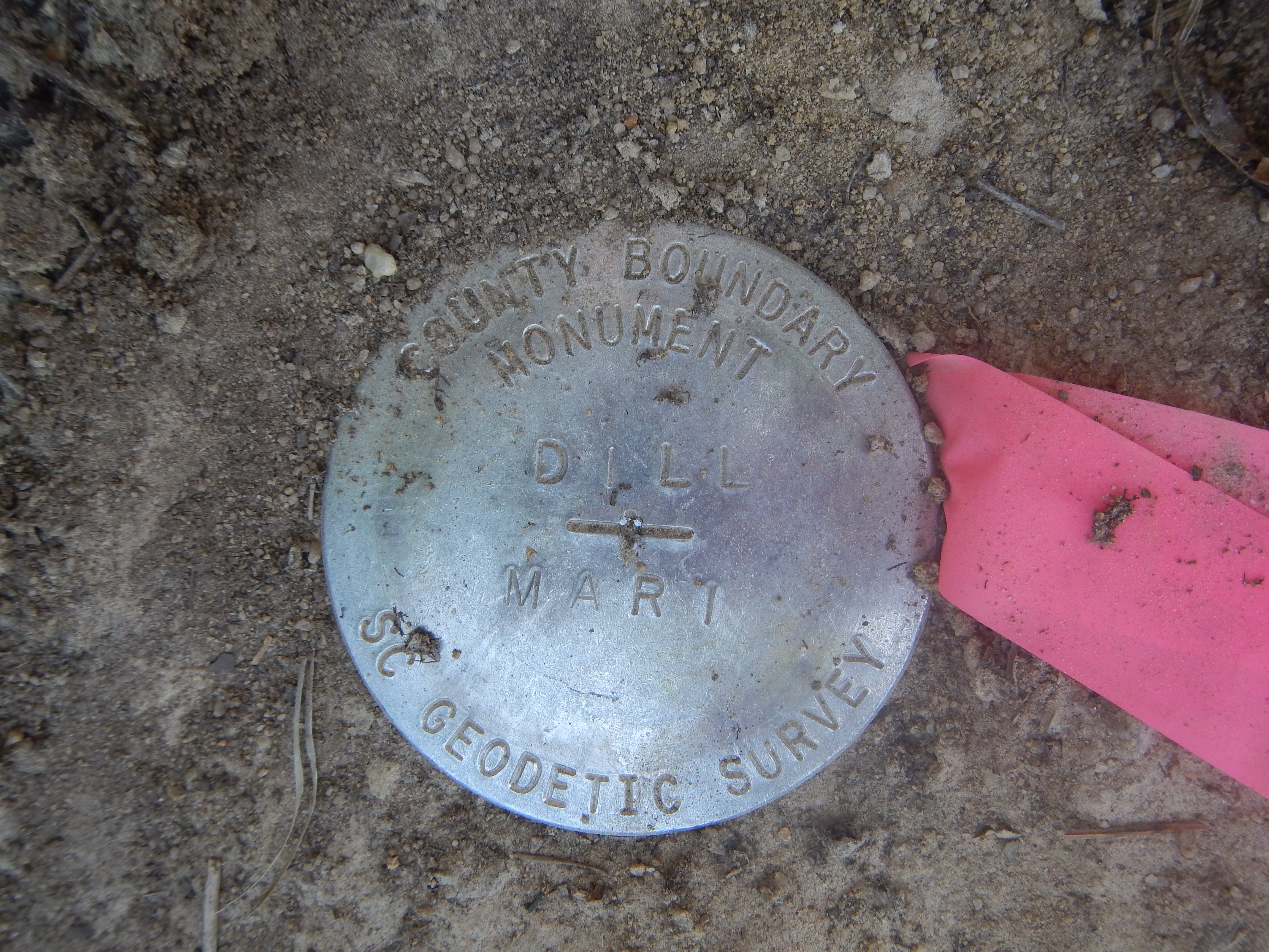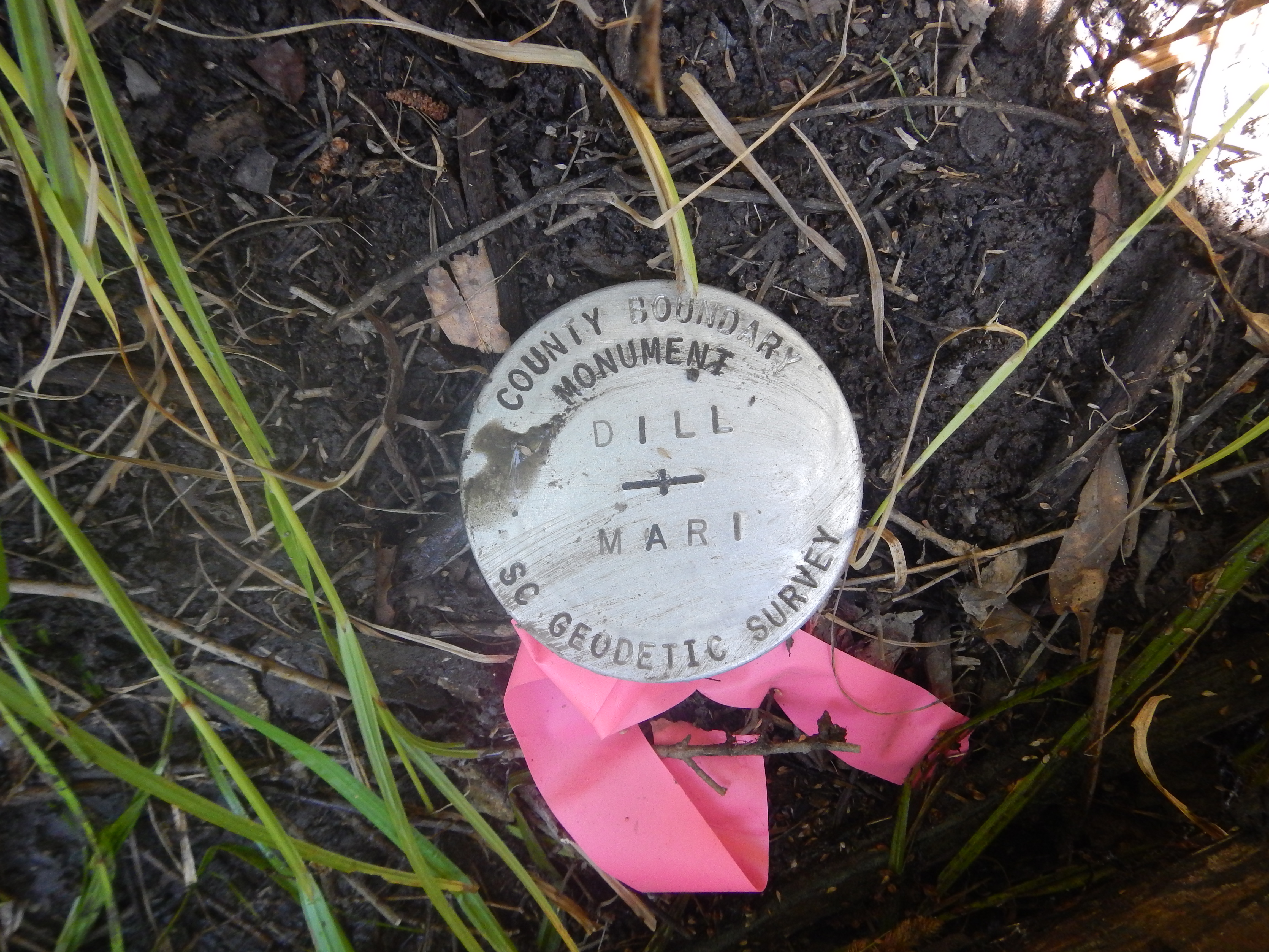 “...the bridge on the river road to a stake X 111 N.; thence N. 75° 56' E. 4,395 feet to a stake X 111 N., at the intersection of Gum Swamp and Cud Swamp; thence up the run of Cud Swamp to the public road leading from L. D. Haselden's to Sellers, to a stake near bridge; thence N. 82° 47' E. 3,061 feet along said road to the town limits of Seller's to a stake; thence N. 10° 26' W. 3,496.5 feet to a stake X; thence N. 87° 43' E. 2,100 feet to a stake X; thence N. 53° 22' E. 1,335 feet to a stake X; thence S. 56° 32' E. 1,107 feet to a stake X; thence N. 82° 30' E. 11,801 feet to a stake; thence N. 69° 40' E. 5,678 feet to an iron stake west side of the Marion and Latta public road near the property now or formerly owned by David Watson; thence N. 88° 30' E. 2,305 feet to an iron stake of the public highway leading from Latta towards Marion, South Carolina, on the old Bryant place, the said roads being the ones heretofore referred to in the original petition setting forth the boundary lines of the proposed new county; thence S. 89° 10' E. 6,940 feet to a stake X; thence S. 68° 72' E. 4,920 feet to a stake X; thence S. 60° 10' E. 20,545 feet to a stake X at east side of railroad; thence N. 51° 37' E. 4,242 feet to its intersection with Buck Swamp; thence down the run of Buck Swamp with its various courses and distances to its junction with Little Pee Dee River; thence a straight line N. 48° 40' E. 17,300 feet to a stake X 111 N.; thence a straight line S. 44° 48' E. 18,924 feet to a cypress tree X 3 N. at the junction of Ash Pole Swamp and Lumber River...”