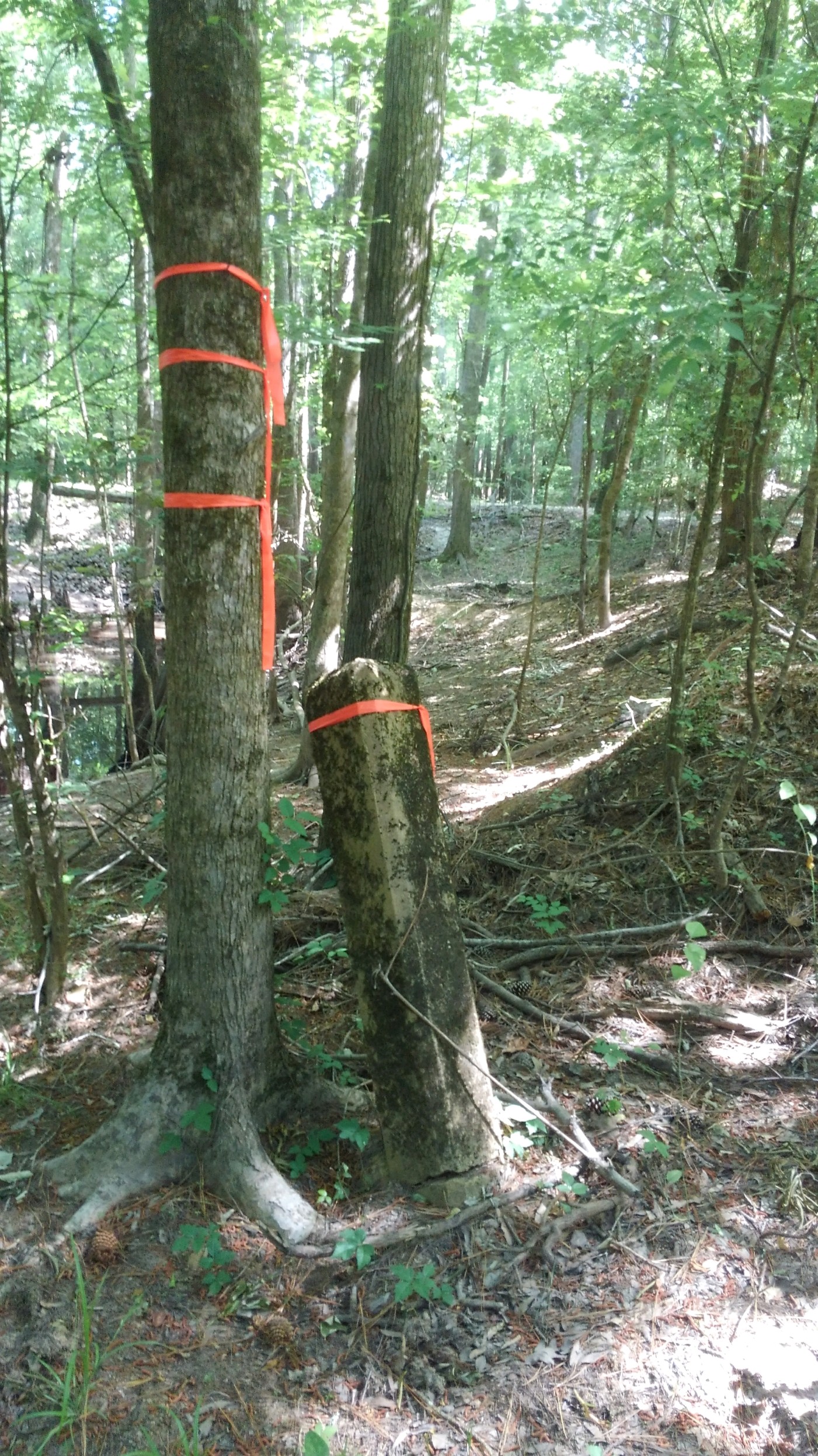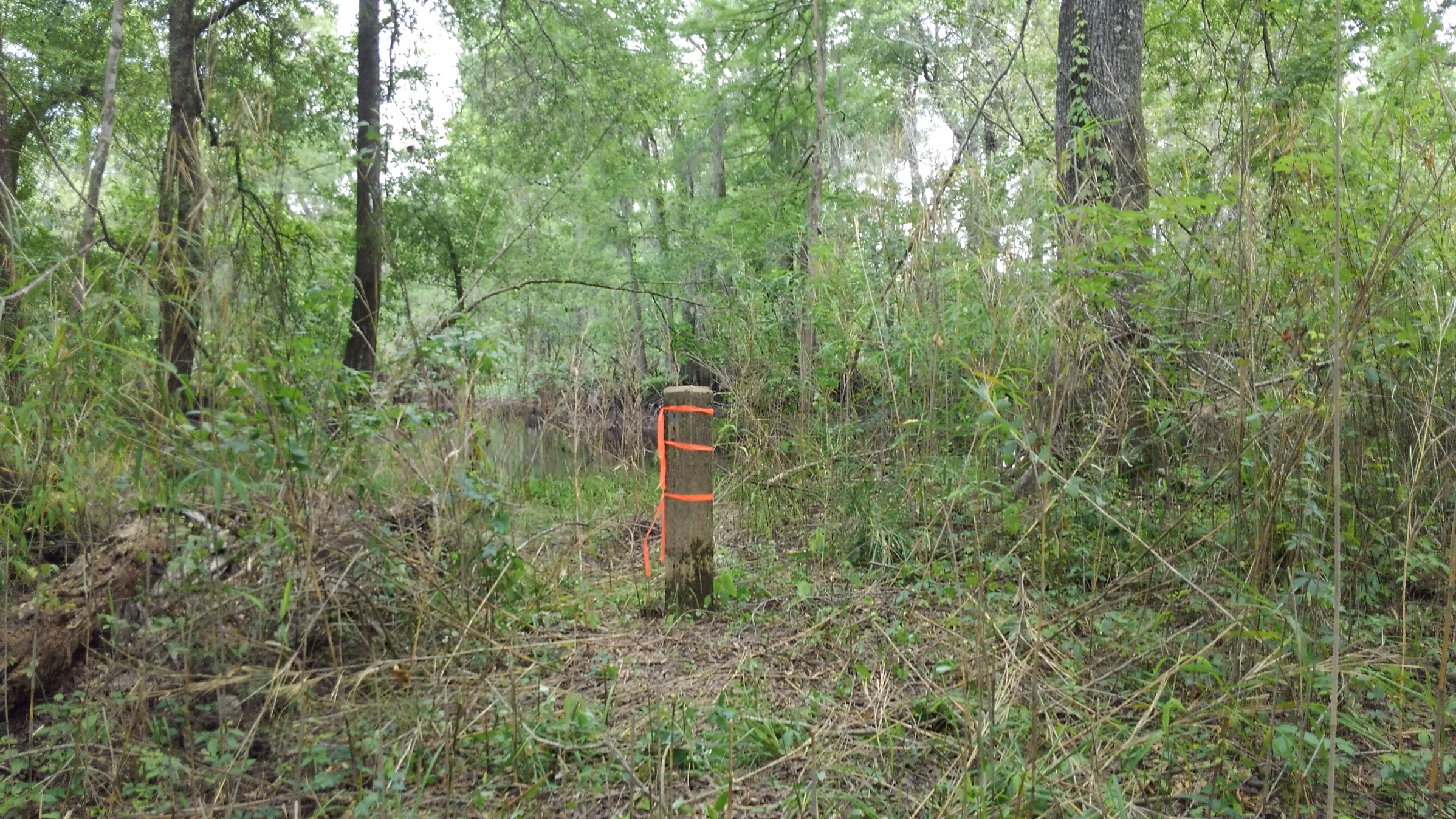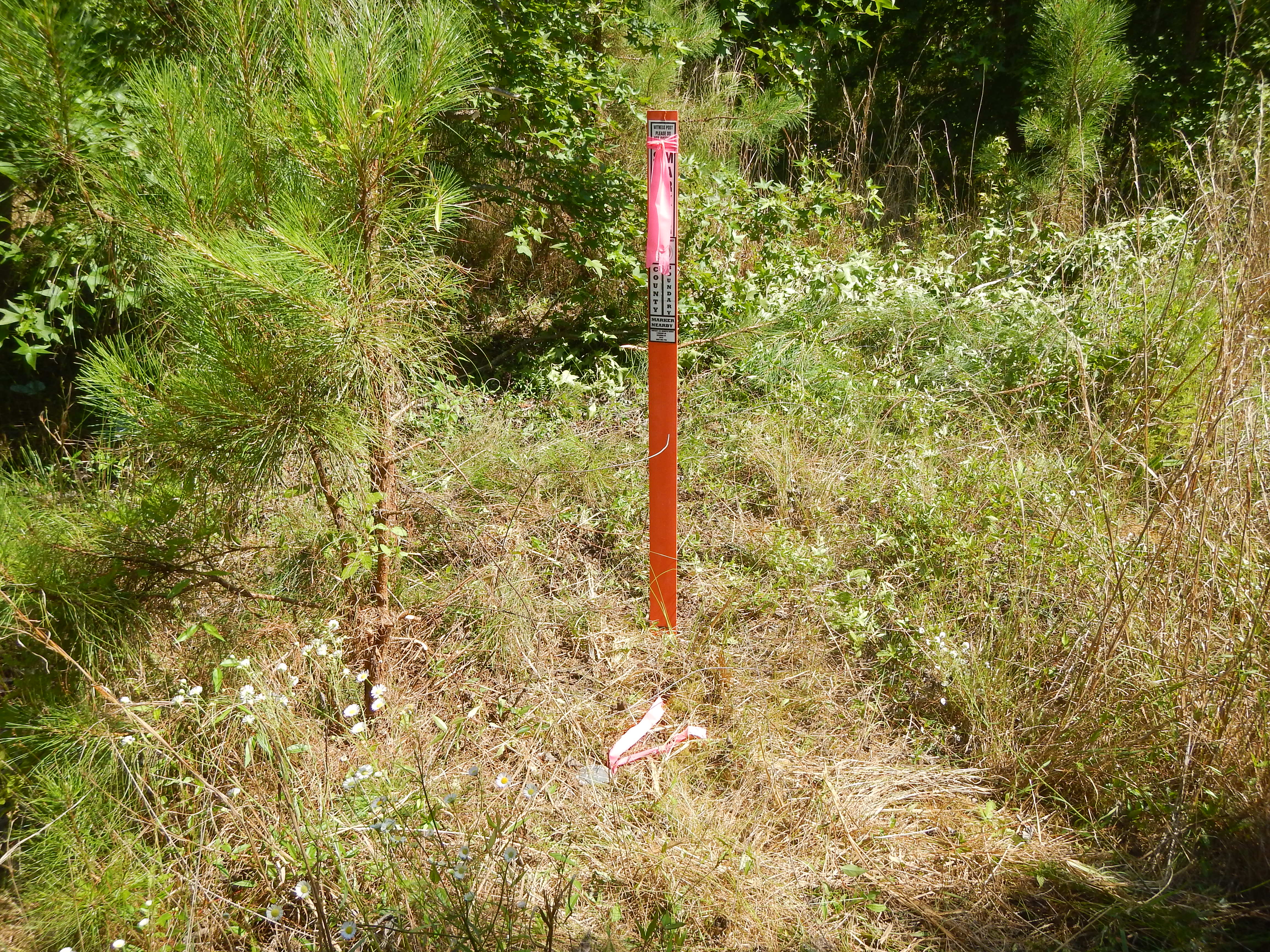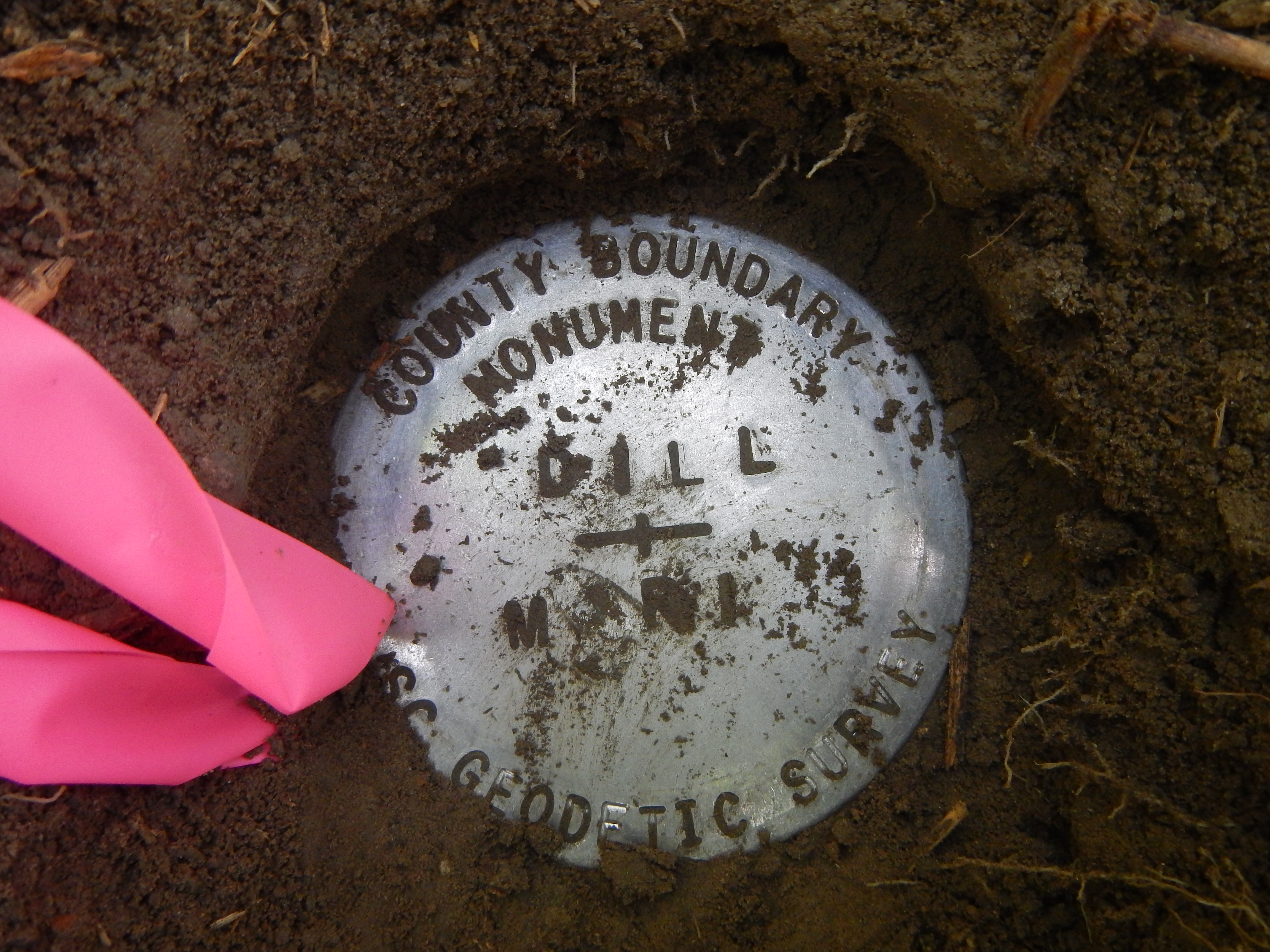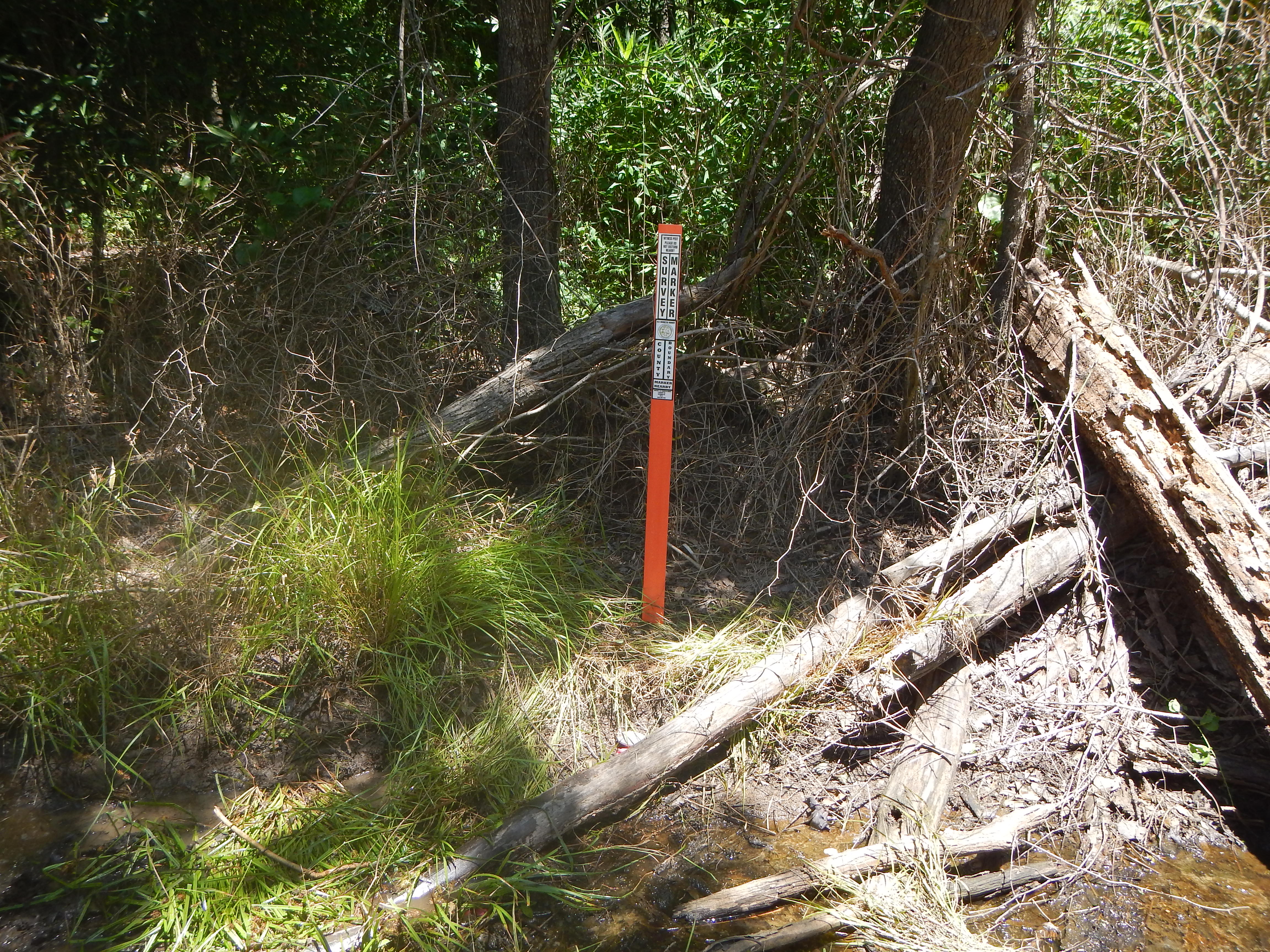 “...the bridge on the river road to a stake X 111 N.; thence N. 75° 56' E. 4,395 feet to a stake X 111 N., at the intersection of Gum Swamp and Cud Swamp; thence up the run of Cud Swamp to the public road leading from L. D. Haselden's to Sellers, to a stake near bridge; thence N. 82° 47' E. 3,061 feet along said road to the town limits of Seller's to a stake; thence N. 10° 26' W. 3,496.5 feet to a stake X; thence N. 87° 43' E. 2,100 feet to a stake X; thence N. 53° 22' E. 1,335 feet to a stake X; thence S. 56° 32' E. 1,107 feet to a stake X; thence N. 82° 30' E. 11,801 feet to a stake; thence N. 69° 40' E. 5,678 feet to an iron stake west side of the Marion and Latta public road near the property now or formerly owned by David Watson; thence N. 88° 30' E. 2,305 feet to an iron stake of the public highway leading from Latta towards Marion, South Carolina, on the old Bryant place, the said roads being the ones heretofore referred to in the original petition setting forth the boundary lines of the proposed new county; thence S. 89° 10' E. 6,940 feet to a stake X; thence S. 68° 72' E. 4,920 feet to a stake X; thence S. 60° 10' E. 20,545 feet to a stake X at east side of railroad; thence N. 51° 37' E. 4,242 feet to its intersection with Buck Swamp; thence down the run of Buck Swamp with its various courses and distances to its junction with Little Pee Dee River; thence a straight line N. 48° 40' E. 17,300 feet to a stake X 111 N.; thence a straight line S. 44° 48' E. 18,924 feet to a cypress tree X 3 N. at the junction of Ash Pole Swamp and Lumber River...”