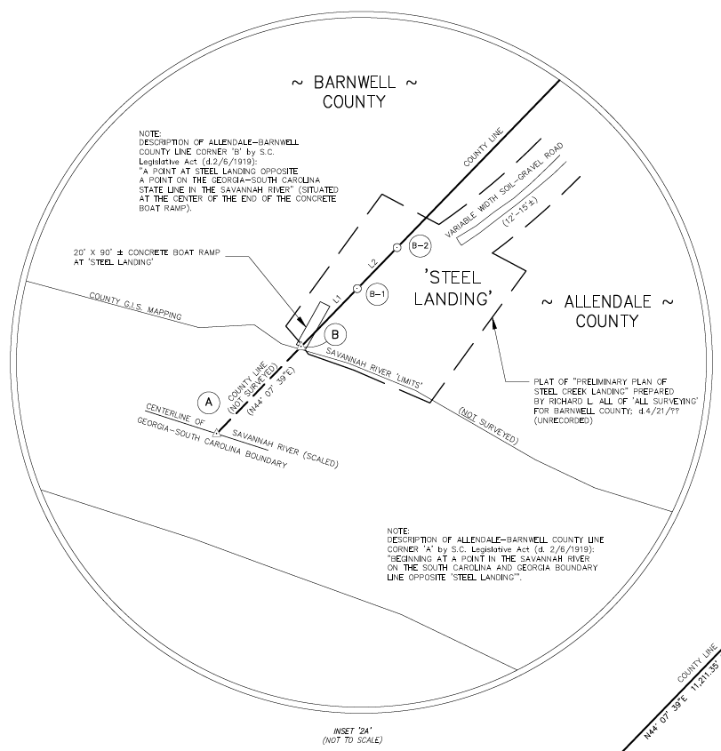 Allendale County is bounded as follows: beginning at a point in the Savannah River on the South Carolina and Georgia boundary line opposite Steel Landing and running in a northerly direction to a stake at Steel Landing; thence a straight line N. 43� E. about 6.12 miles to a stake at or near the intersection of the Barnwell-Robbins public road with a road leading to Millett; thence S. 73� E. about 5.23 miles to a stake at or near Stinson's Bridge on Lower Three Runs; thence S. 70� E. about 5.50 miles at a stake at or near Goodson's Mill site; thence E. about 4.72 miles to a stake on Well Branch;