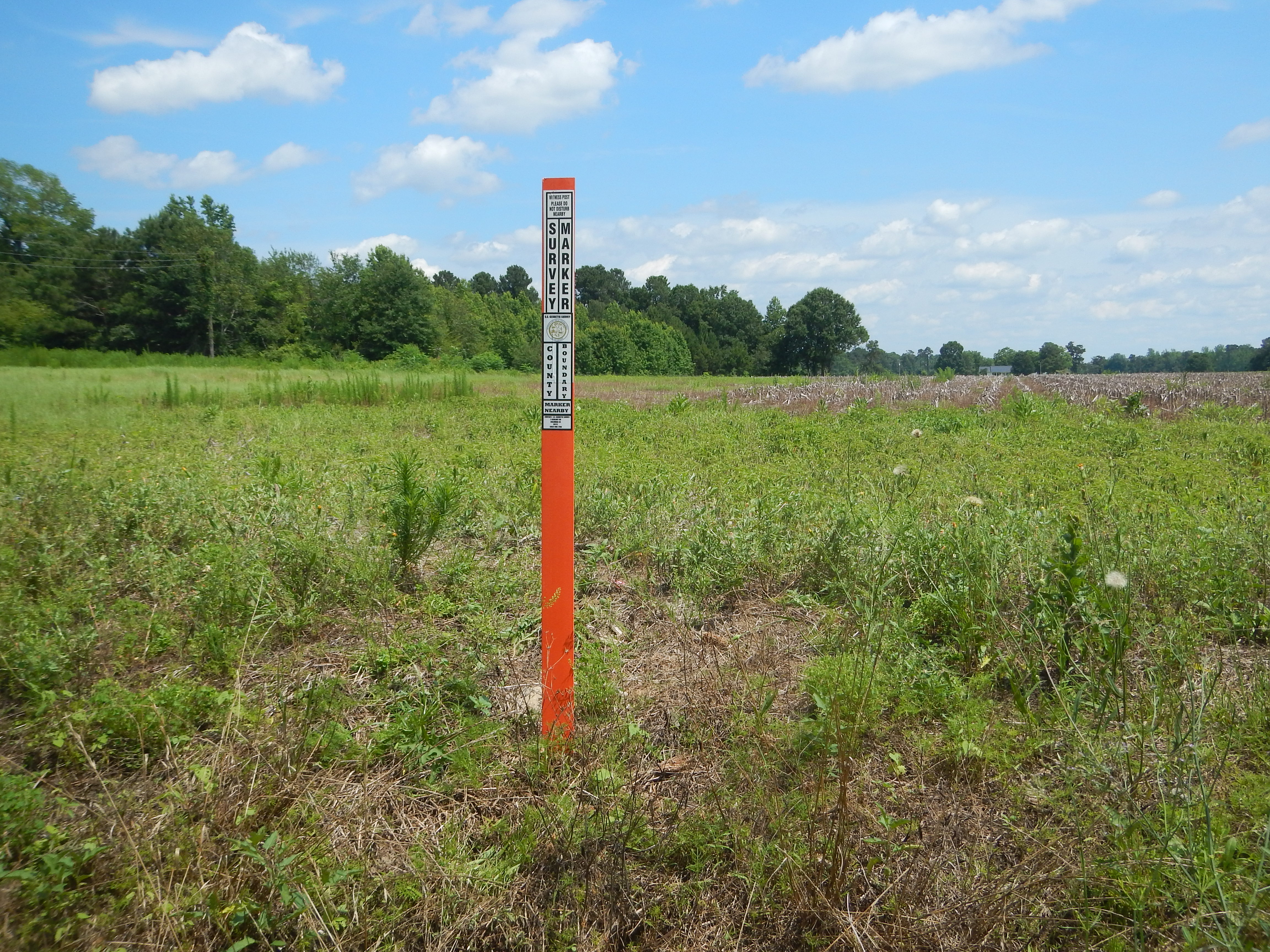 “...the bridge on the river road to a stake X 111 N.; thence N. 75° 56' E. 4,395 feet to a stake X 111 N., at the intersection of Gum Swamp and Cud Swamp; thence up the run of Cud Swamp to the public road leading from L. D. Haselden's to Sellers, to a stake near bridge; thence N. 82° 47' E. 3,061 feet along said road to the town limits of Seller's to a stake; thence N. 10° 26' W. 3,496.5 feet to a stake X; thence N. 87° 43' E. 2,100 feet to a stake X; thence N. 53° 22' E. 1,335 feet to a stake X; thence S. 56° 32' E. 1,107 feet to a stake X; thence N. 82° 30' E. 11,801 feet to a stake; thence N. 69° 40' E. 5,678 feet to an iron stake west side of the Marion and Latta public road near the property now or formerly owned by David Watson; thence N. 88° 30' E. 2,305 feet to an iron stake of the public highway leading from Latta towards Marion, South Carolina, on the old Bryant place, the said roads being the ones heretofore referred to in the original petition setting forth the boundary lines of the proposed new county; thence S. 89° 10' E. 6,940 feet to a stake X; thence S. 68° 72' E. 4,920 feet to a stake X; thence S. 60° 10' E. 20,545 feet to a stake X at east side of railroad; thence N. 51° 37' E. 4,242 feet to its intersection with Buck Swamp; thence down the run of Buck Swamp with its various courses and distances to its junction with Little Pee Dee River; thence a straight line N. 48° 40' E. 17,300 feet to a stake X 111 N.; thence a straight line S. 44° 48' E. 18,924 feet to a cypress tree X 3 N. at the junction of Ash Pole Swamp and Lumber River...”