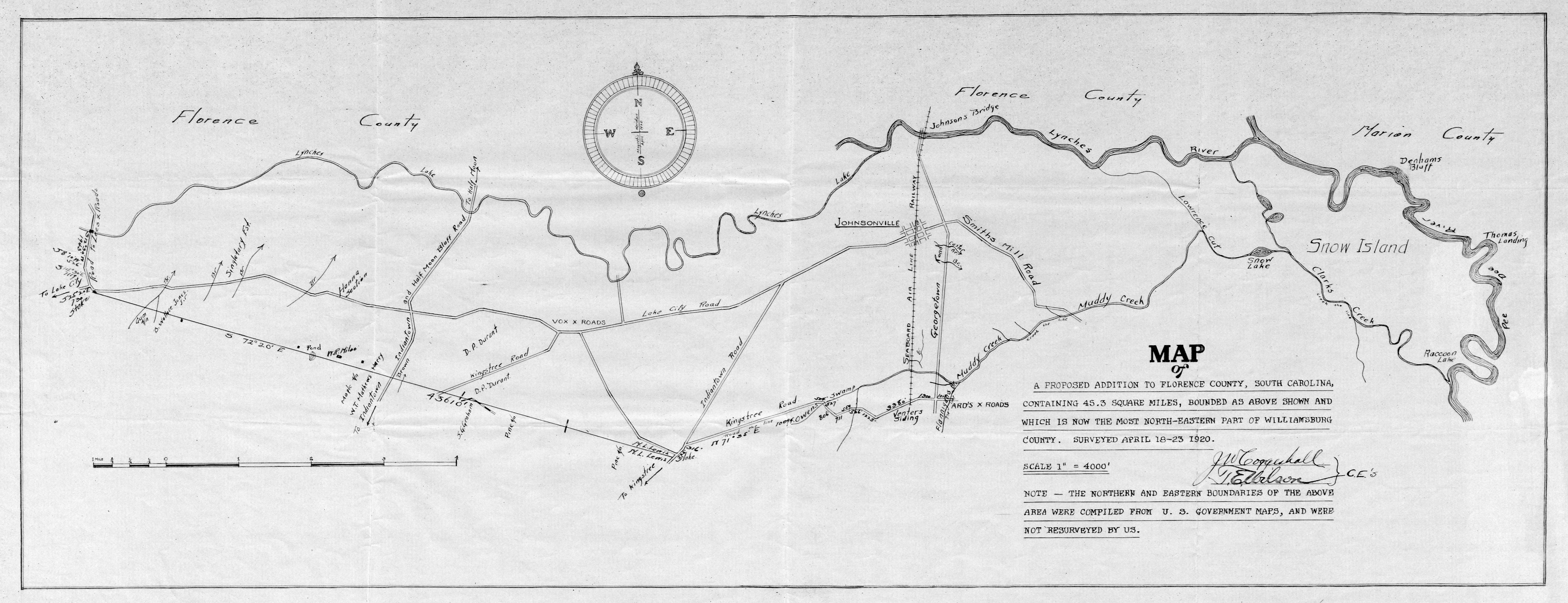 - § Coggeshall, J.W.; Wilson, T.E.. Map of a Proposed Addition to Florence County, South Carolina, dated April 18-23, 1920: Map. Provided by the South Carolina Department of Archives and History, <Series S213201>