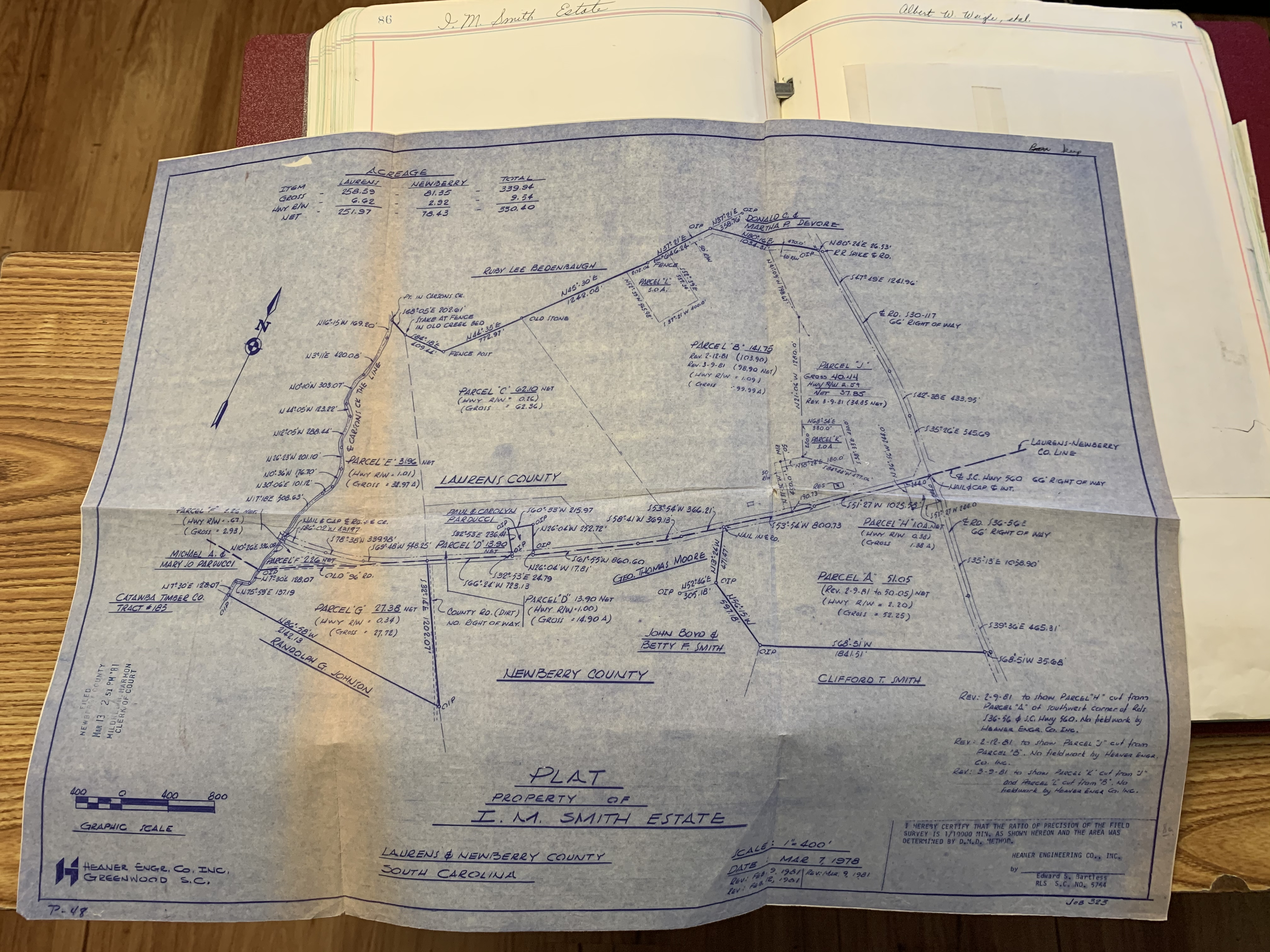 - Y HEANER ENGR. CO. INC.; LAST REVISED MAR. 9, 19B1; LAURENS COUNTY MB. 42 PG. 187; NEWBERRY COUNTY MB. AX PG. 86.